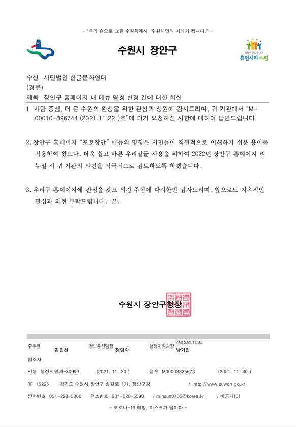 | [공문] 포토장안이라는 외국어 대신 쉬운 우리말을 사용해 주십시오. - 2021.11.22 수원시 장안구 (0) | 2021.12.03 |