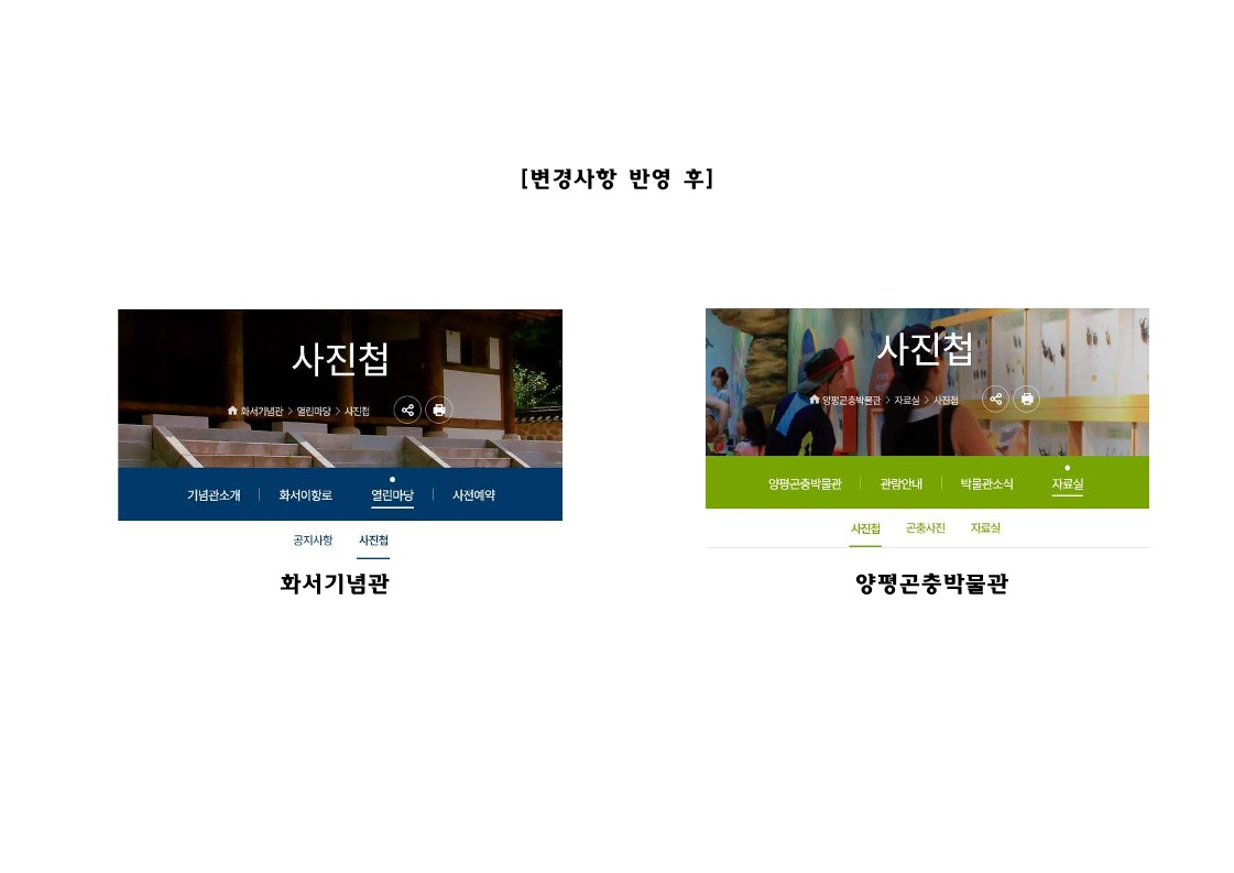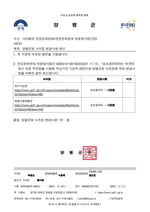 2. 한글문화연대 쉬운말사업단 M00010-801802(2021.11.16., "포토갤러리라는 외국어 대신 쉬운 우리말을 사용해 주십시오.")호와 관련으로 양평군청 누리집에 대한 변경사항을 아래와 같이 회신합니다.