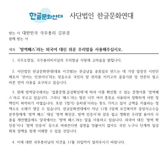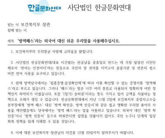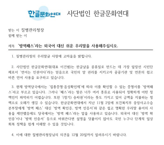 3. 현재 방역당국에서는 ‘접종증명·음성확인제’에 따라 이를 확인할 수 있는 증명서를 ‘방역패스’라고 부르고 있습니다. 그러나 ‘패스’라는 말은 너무 여러 종류로 사용되어 정확하게 어떤 정책인지 파악하기 어렵습니다. 또한 ‘(정기) 승차권’이라는 뜻도 가지고 있어 금액을 지불하는 정책으로 오해가 생길 수 있습니다. 한글문화연대에서 지난 11월 2일에 보건복지부 중앙사고수습본부장에게 ‘방역 패스’ 대신 ‘방역 확인증, 방역 인증서’와 같은 쉽고 명확한 우리말 용어의 사용을 제안했음에도 당국에서는 ‘방역 패스’라는 말을 사용하고 있습니다. 외국어 대신 ‘방역 확인증’이나 ‘방역 인증서’ 등으로 바꿔쓴다면 설명을 덧붙이지 않아도 국민 누구나 단계적 일상회복 정책을 쉽게 이해할 수 있을 것입니다.