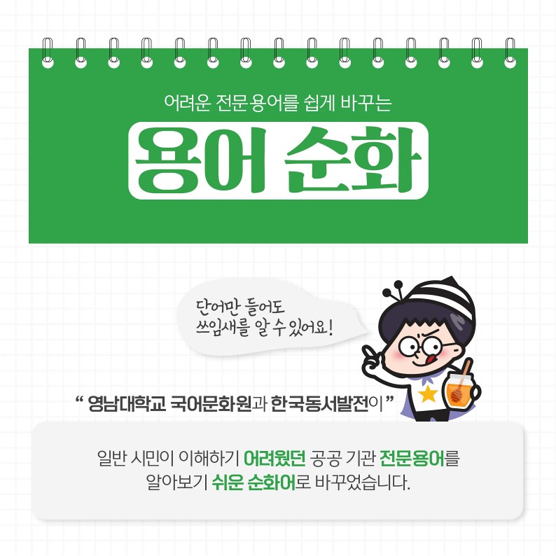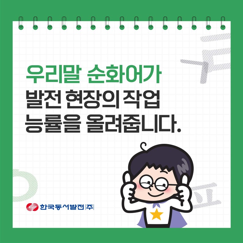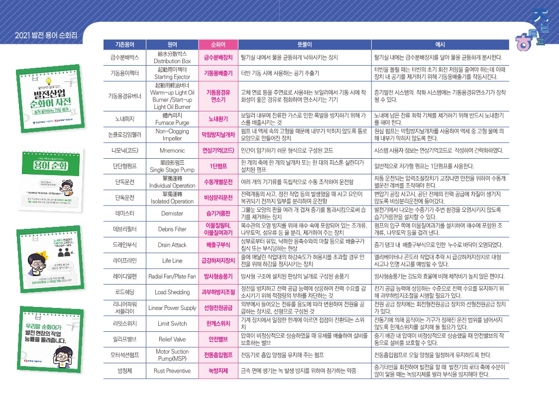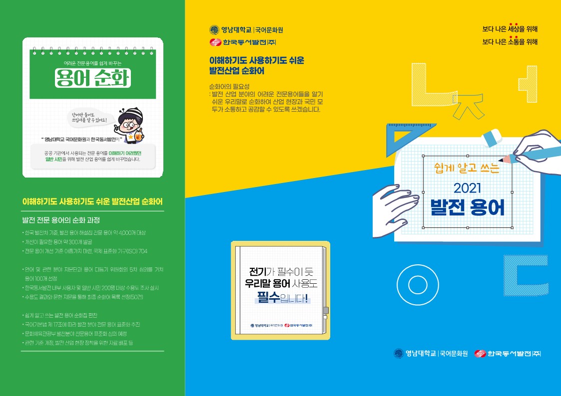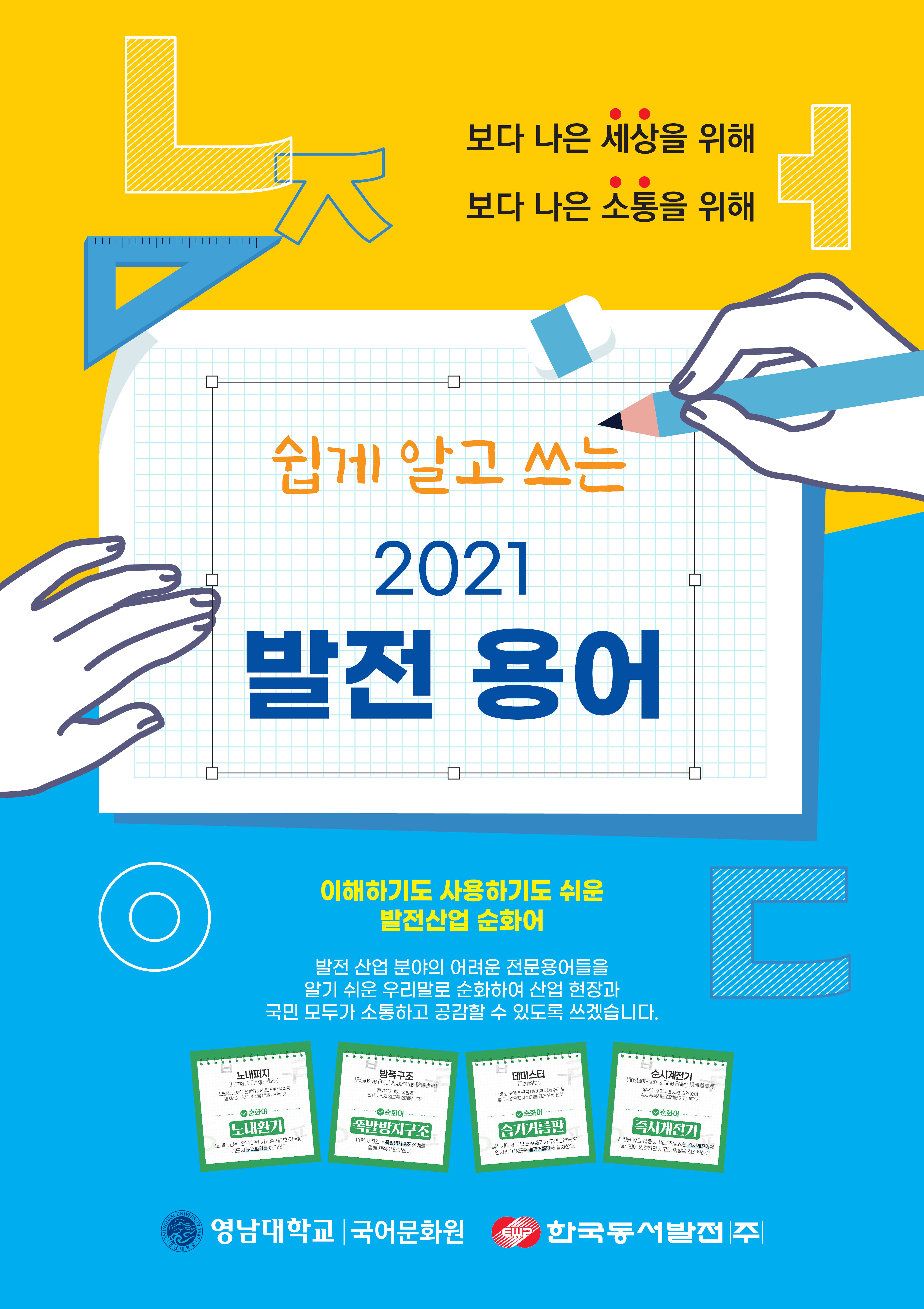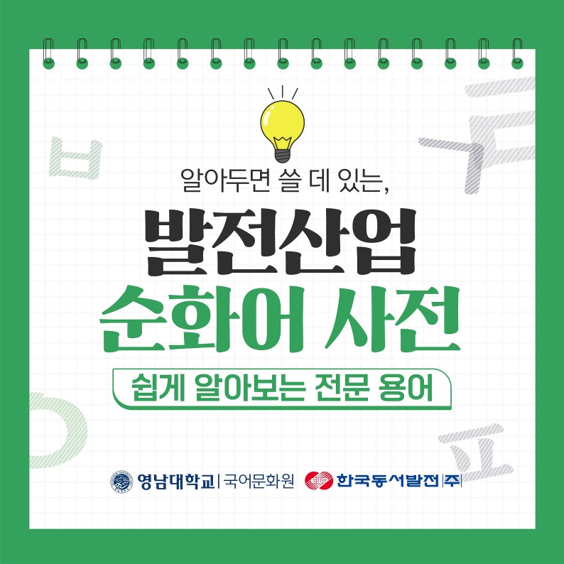 영남대학교 국어문화원과 한국동서발전이 발전 산업 분야의 어려운 전문용어들을 알기 쉬운 우리말로 순화하여 산업 현장과 국민 모두가 소통하고 공감할 수 있도록 노력하였습니다.