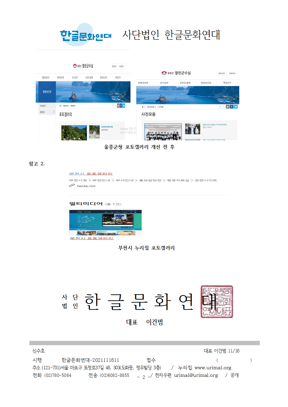 | [공문/답변] 포토갤러리라는 외국어 대신 쉬운 우리말을 사용해 주십시오. - 2021.12.03 부천시 (0) | 2021.12.21 |