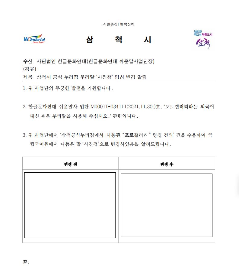 3. 귀 사업단에서 ‘삼척공식누리집에서 사용된 “포토갤러리 ” 명칭 건의’ 건을 수용하여 국 립국어원에서 다듬은 말 ‘사진첩’으로 변경하였음을 알려드립니다 .