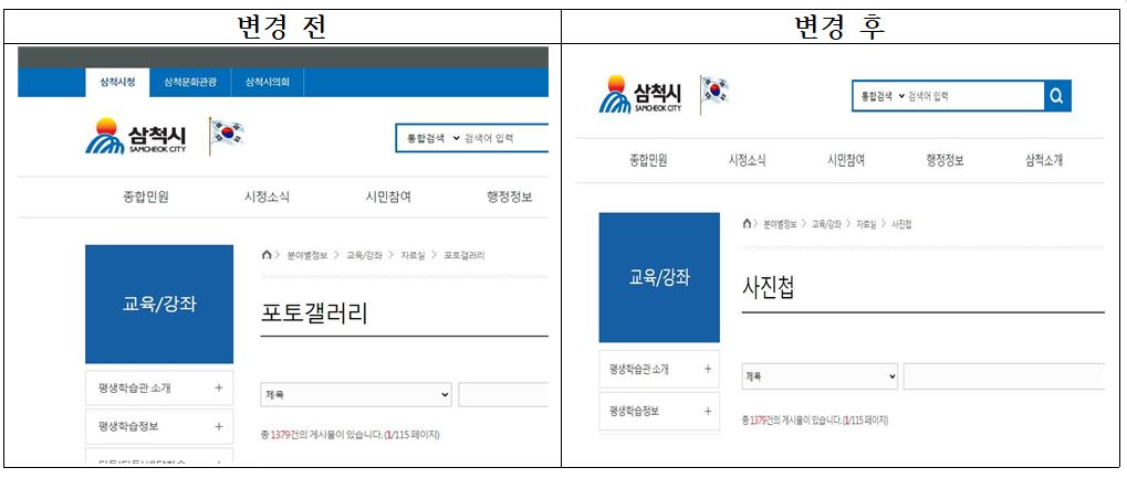 | [공문] 포토갤러리라는 외국어 대신 쉬운 우리말을 사용해 주십시오. - 2021.11.30 삼척시 (0) | 2021.12.21 |