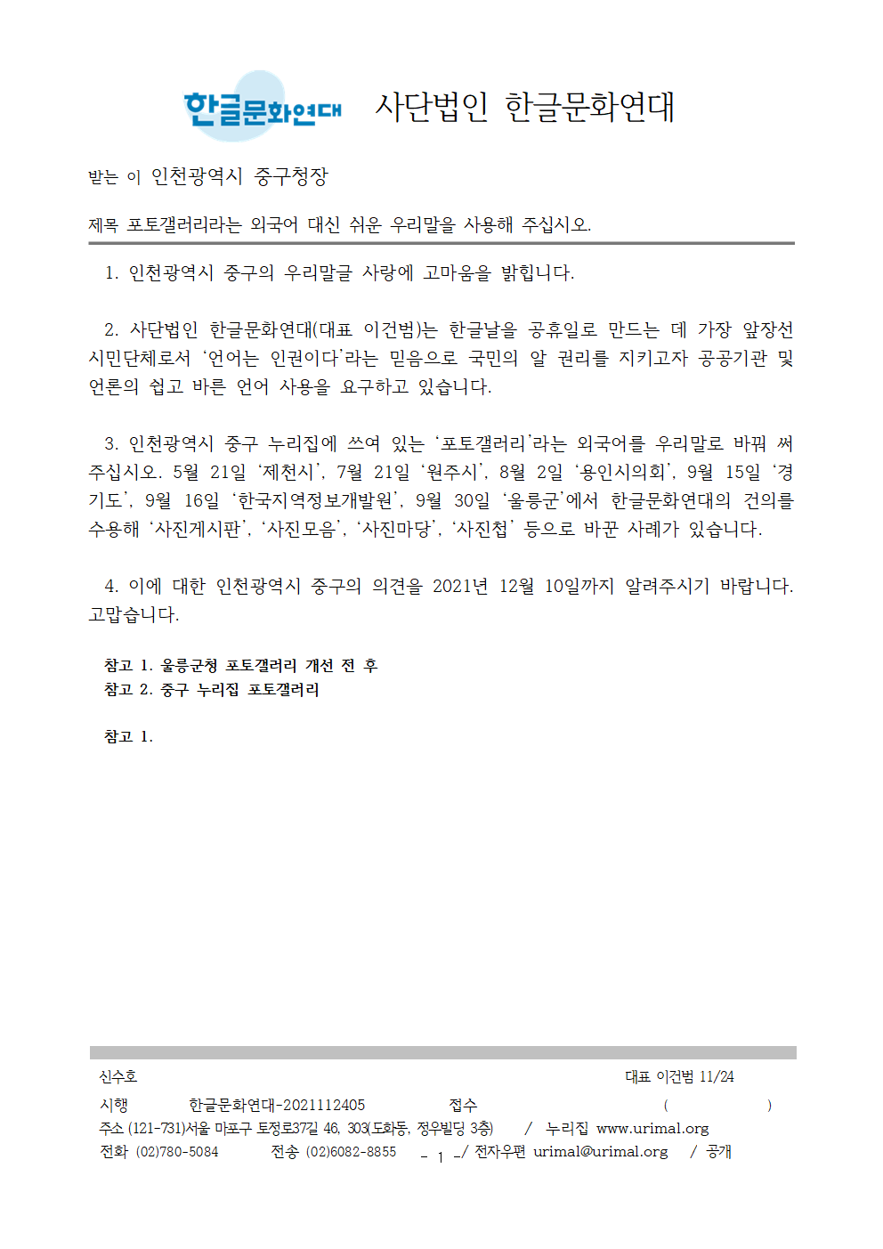 | [공문/답변] 포토갤러리라는 외국어 대신 쉬운 우리말을 사용해 주십시오. - 2021.12.13 인천광역시 중구 (0) | 2021.12.21 |