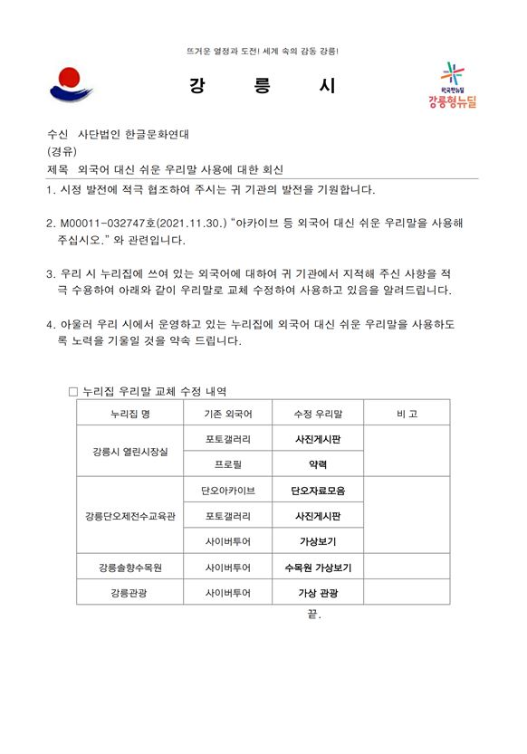 | [공문] 아카이브 등 외국어 대신 쉬운 우리말을 사용해 주십시오. - 2021.11.30 강릉시 (0) | 2021.12.21 |