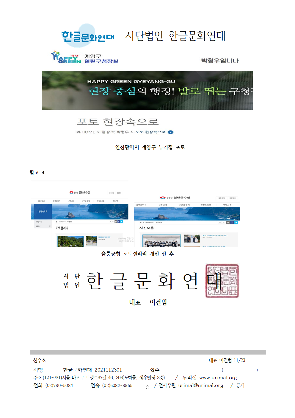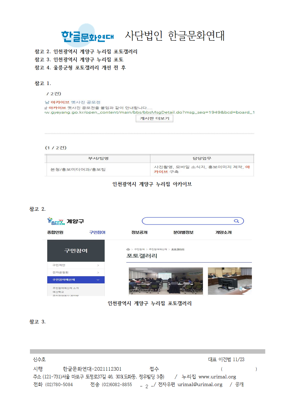 3. 계양구청 누리집에 쓰여 있는 포토갤러리’, ‘포토라는 외국어를 우리말로 바꿔 써 주십시오. 521제천시’, 721원주시’, 82용인시의회’, 915경기도’, 916한국지역정보개발원’, 930울릉군에서 한글문화연대의 건의를 수용해 사진게시판’, ‘사진모음’, ‘사진마당’, ‘사진첩등으로 바꾼 사례가 있습니다.