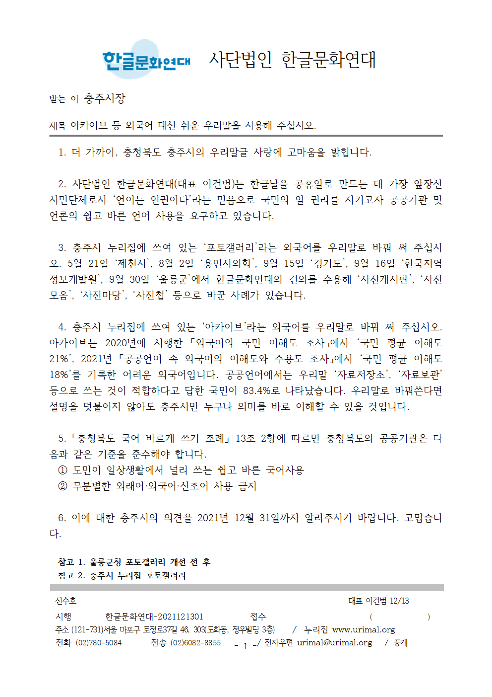 [공문] 아카이브 등 외국어 대신 쉬운 우리말을 사용해 주십시오. - 2021.12.13 충주시