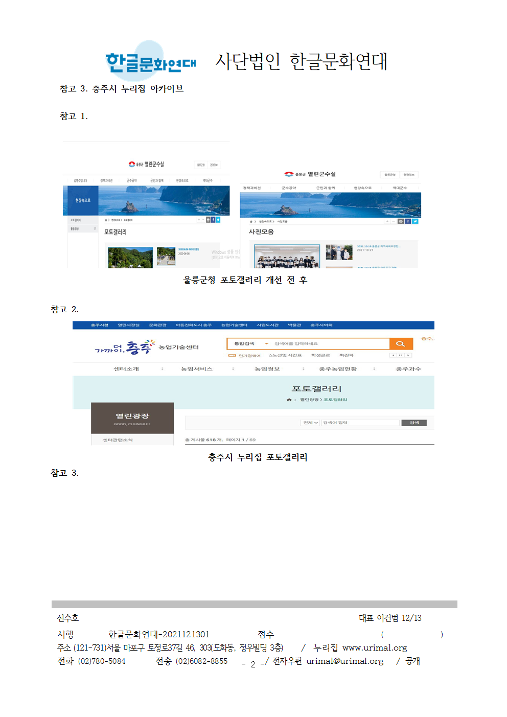 3. 충주시 누리집에 쓰여 있는 포토갤러리라는 외국어를 우리말로 바꿔 써 주십시오. 521제천시’, 82용인시의회’, 915경기도’, 916한국지역정보개발원’, 930울릉군에서 한글문화연대의 건의를 수용해 사진게시판’, ‘사진모음’, ‘사진마당’, ‘사진첩등으로 바꾼 사례가 있습니다.