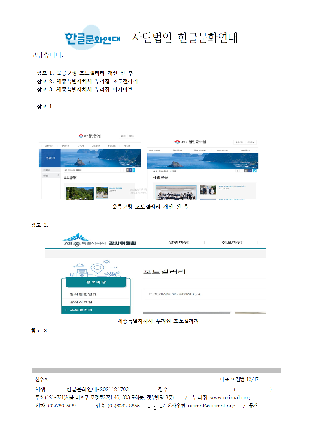 3. 세종특별자치시 누리집에 쓰여 있는 ‘포토갤러리’라는 외국어를 우리말로 바꿔 써 주십시오. 5월 21일 ‘제천시’, 7월 2일 ‘원주시’, 8월 2일 ‘용인시의회’, 9월 15일 ‘경기도’, 9월 16일 ‘한국지역정보개발원’, 9월 30일 ‘울릉군’에서 한글문화연대의 건의를 수용해 ‘사진게시판’, ‘사진모음’, ‘사진마당’, ‘사진첩’ 등으로 바꾼 사례가 있습니다.