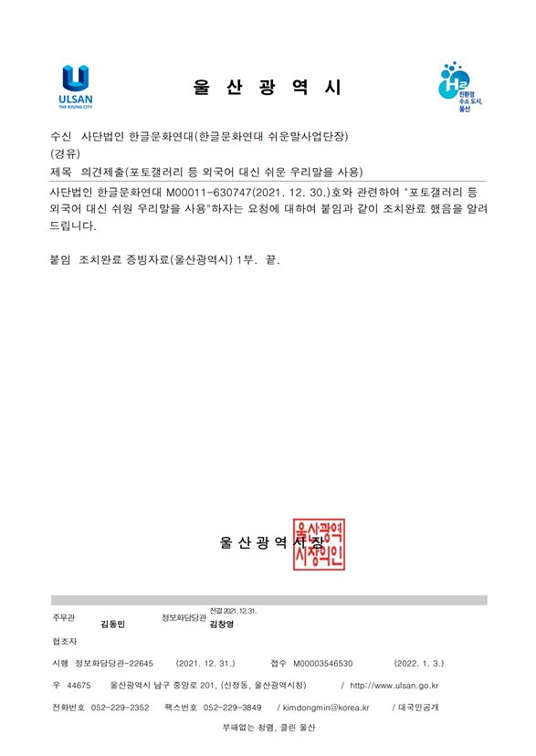 | [공문] 포토갤러리 등 외국어 대신 쉬운 우리말을 사용해 주십시오. - 2021.12.30 울산광역시 (0) | 2022.01.05 |