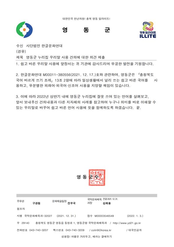 2. 한글문화연대 M00011-380556(2021. 12. 17.)호와 관련하여, 영동군은 「충청북도 국어 바르게 쓰기 조례」13조 2항에 따라 일상생활에서 널리 쓰는 쉽고 바른 국어를 사용하고, 무분별한 외래어·외국어·신조어 사용을 지양할 책임이 있습니다.