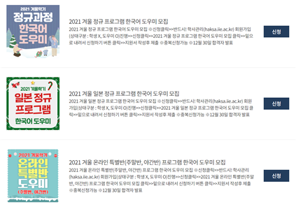 사실 학교생활을 하면서 외국인 친구를 사귈 수 있는 기회가 많지 않다. 특히 외국인 친구와 한국어로 소통할 수 있는 경험은 특별하다. 더불어 먼 나라에 내 친구가 살고 있다는 사실은 낭만적으로 느껴지기도 한다. 한국어 도우미로 활동하면 국제교육원의 외국어 강좌 할인 혜택(30%)과 봉사 시간 32시간, 봉사 경력 증명서를 받을 수 있다. 교환학생을 지원할 때 소정의 가산점도 부여된다. 한국어에 관심이 많고 재밌는 한국 문화를 외국인 학생에게 소개하고 싶은 경희대학교 재학생이라면 꼭 한번 참여해 보길 추천한다. 경희대학교 국제교육원 누리집에 들어가면 매 학기마다 모집하는 한국어 도우미를 신청할 수 있다. 경희대학교뿐만 아니라 여러 대학교에서도 한국어 도우미 제도가 생겨, 한국 대학생들이 외국인 학생에게 한국어를 알려주고 한국 문화를 소개할 기회를 얻길 기대한다.