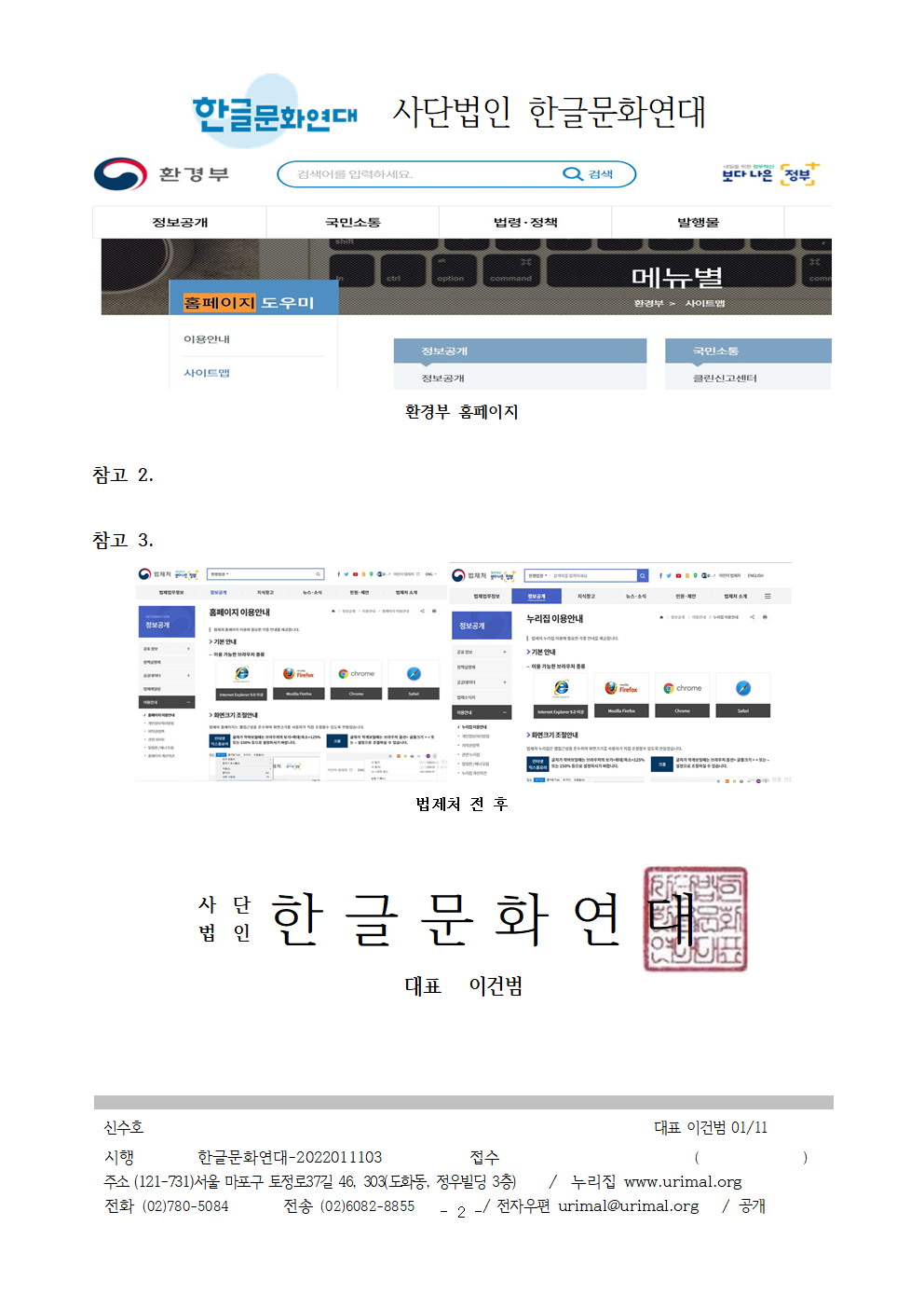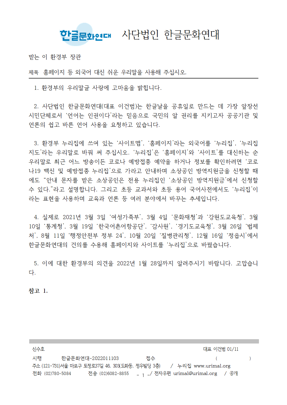| [공문/답변] 홈페이지 등 외국어 대신 쉬운 우리말을 사용해 주십시오. - 환경부 2022.01.18 (0) | 2022.02.10 |