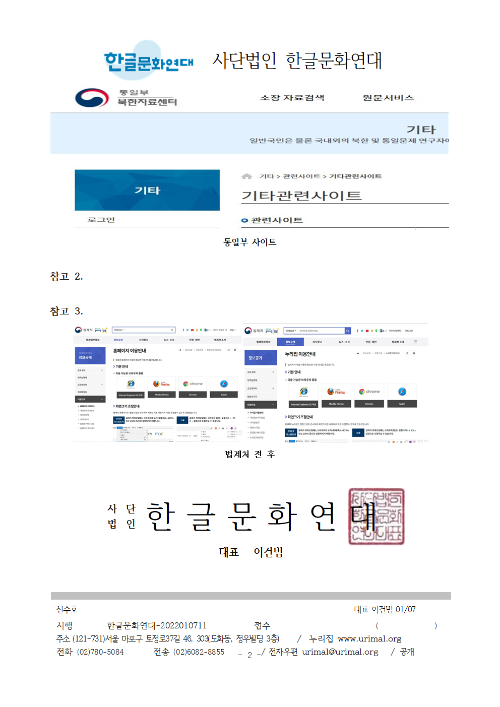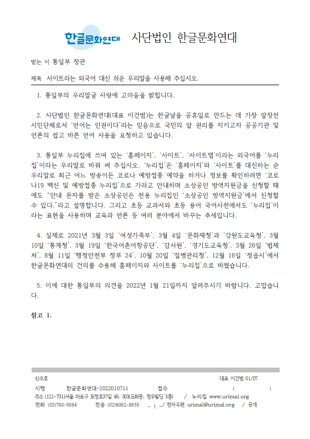 | [공문/답변] 사이트라는 외국어 대신 쉬운 우리말을 사용해 주십시오. - 통일부 2022.01.18 (0) | 2022.02.10 |