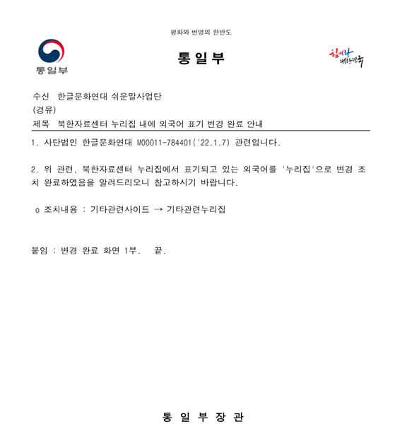 [공문/답변] 사이트라는 외국어 대신 쉬운 우리말을 사용해 주십시오. - 통일부 2022.01.18