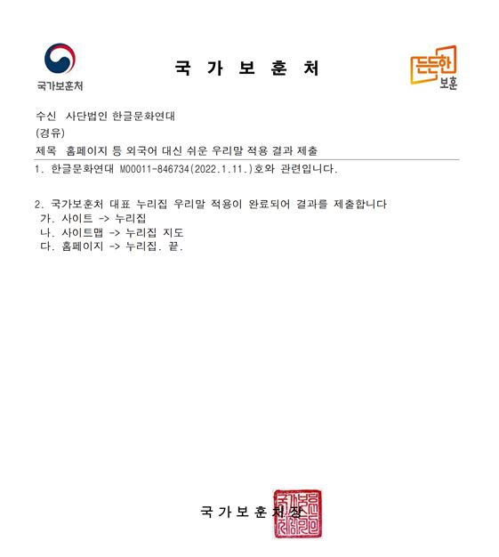 | [공문] 홈페이지 등 외국어 대신 쉬운 우리말을 사용해 주십시오. - 국가보훈처 2022.01.11 (0) | 2022.02.10 |