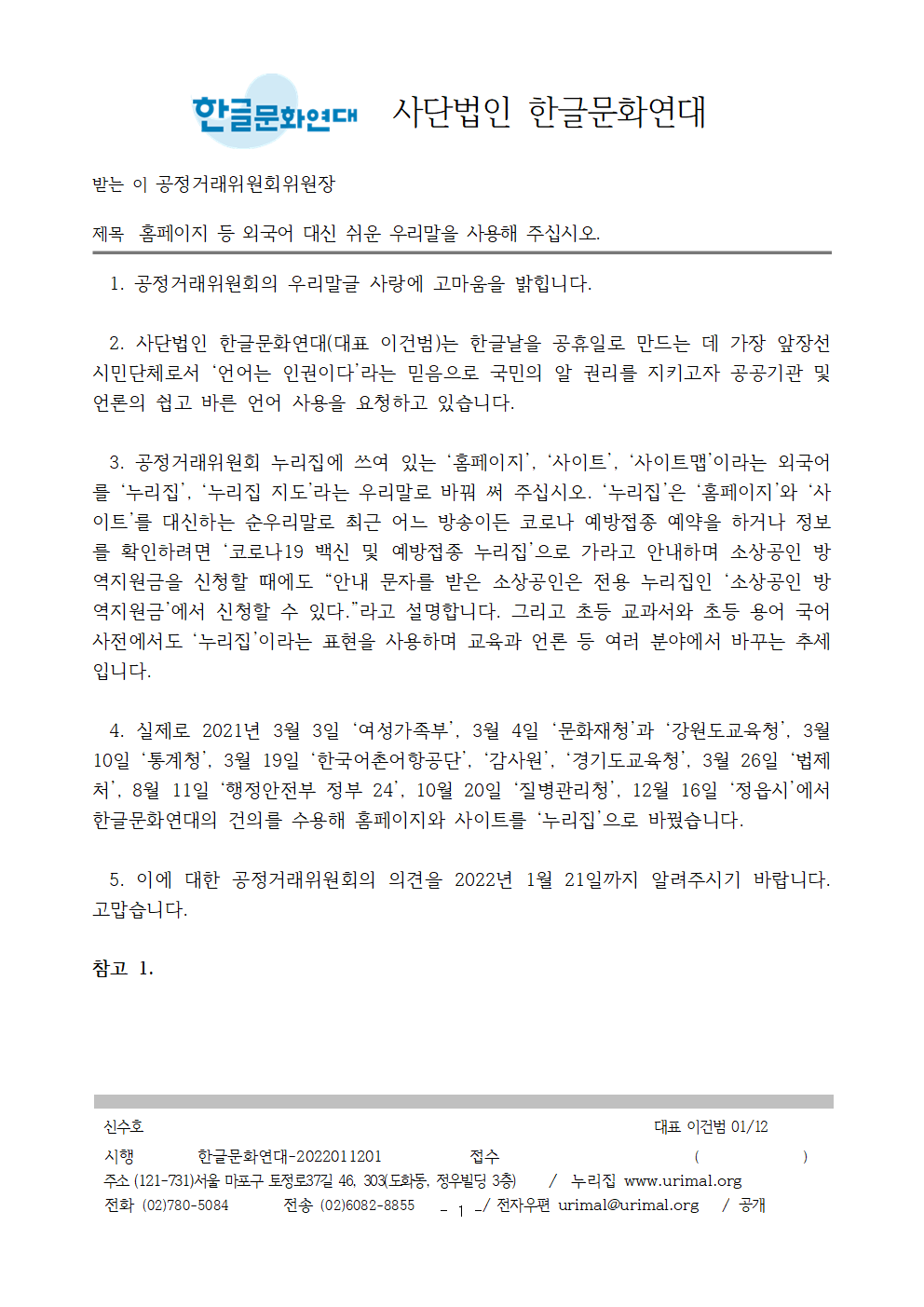 | [공문/답변] 홈페이지 등 외국어 대신 쉬운 우리말을 사용해 주십시오. - 공정거래위원회 2022.01.14 (0) | 2022.02.10 |
