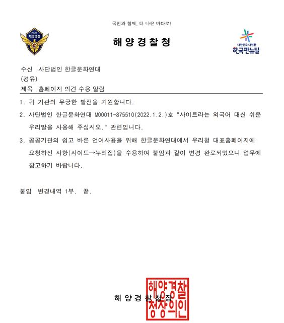 [공문/답변] 사이트라는 외국어 대신 쉬운 우리말을 사용해 주십시오. - 해양경찰청 2022.01.19