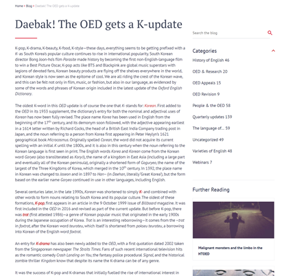 옥스퍼드 공식 블로그. 새롭게 등재된 한국 관련 단어를 설명하고 있다.
