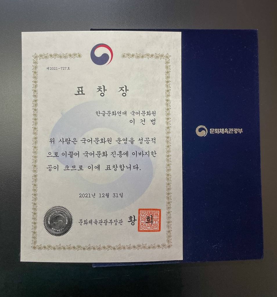 이건범 대표가 국어문화원 운영을 성공적으로 이끌어 국어문화 진흥에 이바지한 공을 인정받아, 문화체육관광부장관으로부터 표창장을 받았습니다. 기쁜 소식을 함께 나눕니다.^^