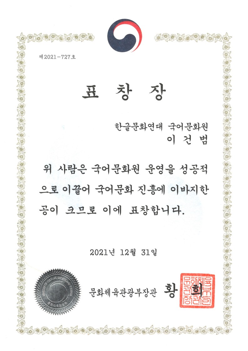 이건범 대표가 국어문화원 운영을 성공적으로 이끌어 국어문화 진흥에 이바지한 공을 인정받아, 문화체육관광부장관으로부터 표창장을 받았습니다. 기쁜 소식을 함께 나눕니다.^^