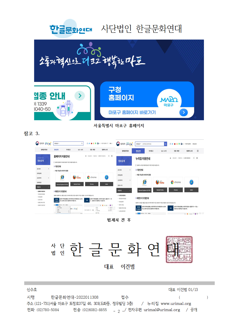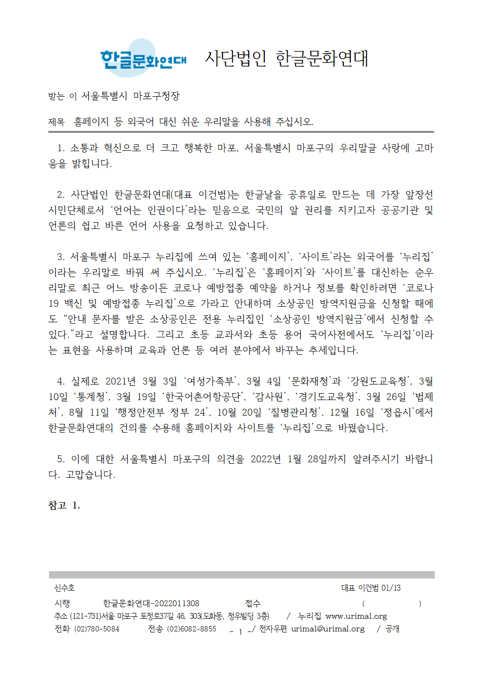 | [공문/답변] 홈페이지 등 외국어 대신 쉬운 우리말을 사용해 주십시오. - 서울특별시 마포구 2022.01.25 (0) | 2022.03.23 |