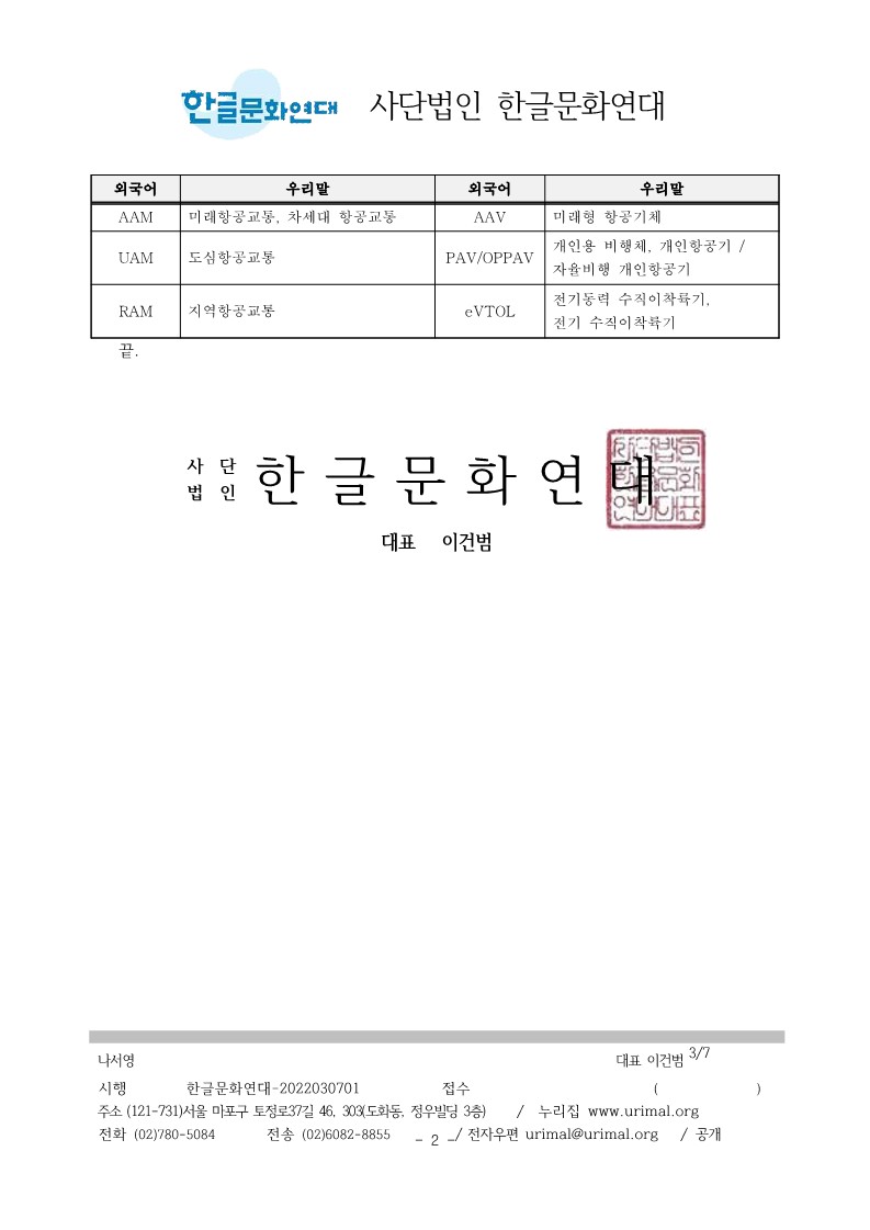 3. 산업통상자원부는 2022년 2월 23일 보도자료를 통해 ‘국내 미래형 항공기체(AAV)’ 개발 전략 방향을 발표하였습니다. 위 보도자료에서는 미래항공 분야의 개념어가 혼재되어 사용됨을 지적하면서, 상위어로 ‘AAM’, ‘AAV’라는 로마자 용어를 제시하였습니다. 또 ‘UAM’, ‘RAM’, ‘PAV’, ‘eVTOL’ 등 로마자 준말을 남발하여 쓰고 있습니다. 그러나 ‘AAM’, ‘AAV’라는 상위어 역시 의미를 짐작하거나 둘을 구분하기 어려우며, 국민에게 생소한 로마자 준말은 개념을 정립하여 홍보하기에 적절하지 않습니다.