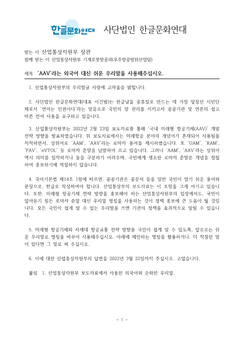 4. 국어기본법 제14조 1항에 따르면, 공공기관은 공문서 등을 일반 국민이 알기 쉬운 용어와 문장으로, 한글로 작성하여야 합니다. 산업통상부의 보도자료는 이 조항을 크게 어기고 있습니다. 또한, 미래형 항공기체 전략 방향을 홍보해야 하는 산업통상자원부의 입장에서도, 국민이 알아듣기 힘든 로마자 준말 대신 우리말 명칭을 사용하는 것이 정책 홍보에 큰 도움이 될 것입니다. 모든 국민이 쉽게 알 수 있는 우리말을 쓰면 기관의 정책을 효과적으로 알릴 수 있습니다.