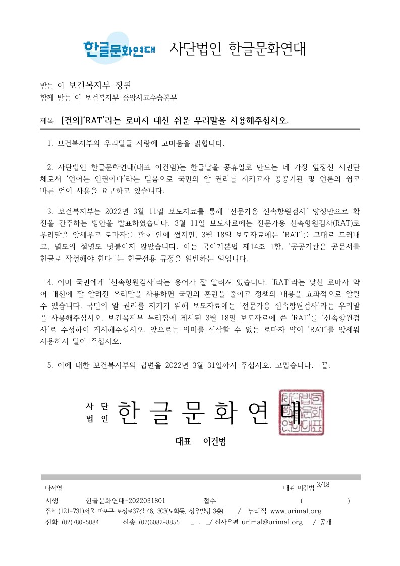4. 이미 국민에게 ‘신속항원검사’라는 용어가 잘 알려져 있습니다. ‘RAT’라는 낯선 로마자 약어 대신에 잘 알려진 우리말을 사용하면 국민의 혼란을 줄이고 정책의 내용을 효과적으로 알릴 수 있습니다. 국민의 알 권리를 지키기 위해 보도자료에는 ‘전문가용 신속항원검사’라는 우리말을 사용해주십시오. 보건복지부 누리집에 게시된 3월 18일 보도자료에 쓴 ‘RAT’를 ‘신속항원검사’로 수정하여 게시해주십시오. 앞으로는 의미를 짐작할 수 없는 로마자 약어 ‘RAT’를 앞세워 사용하지 말아 주십시오.