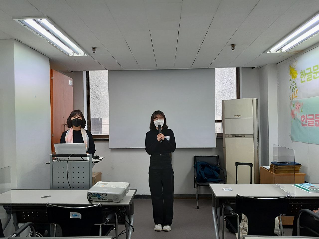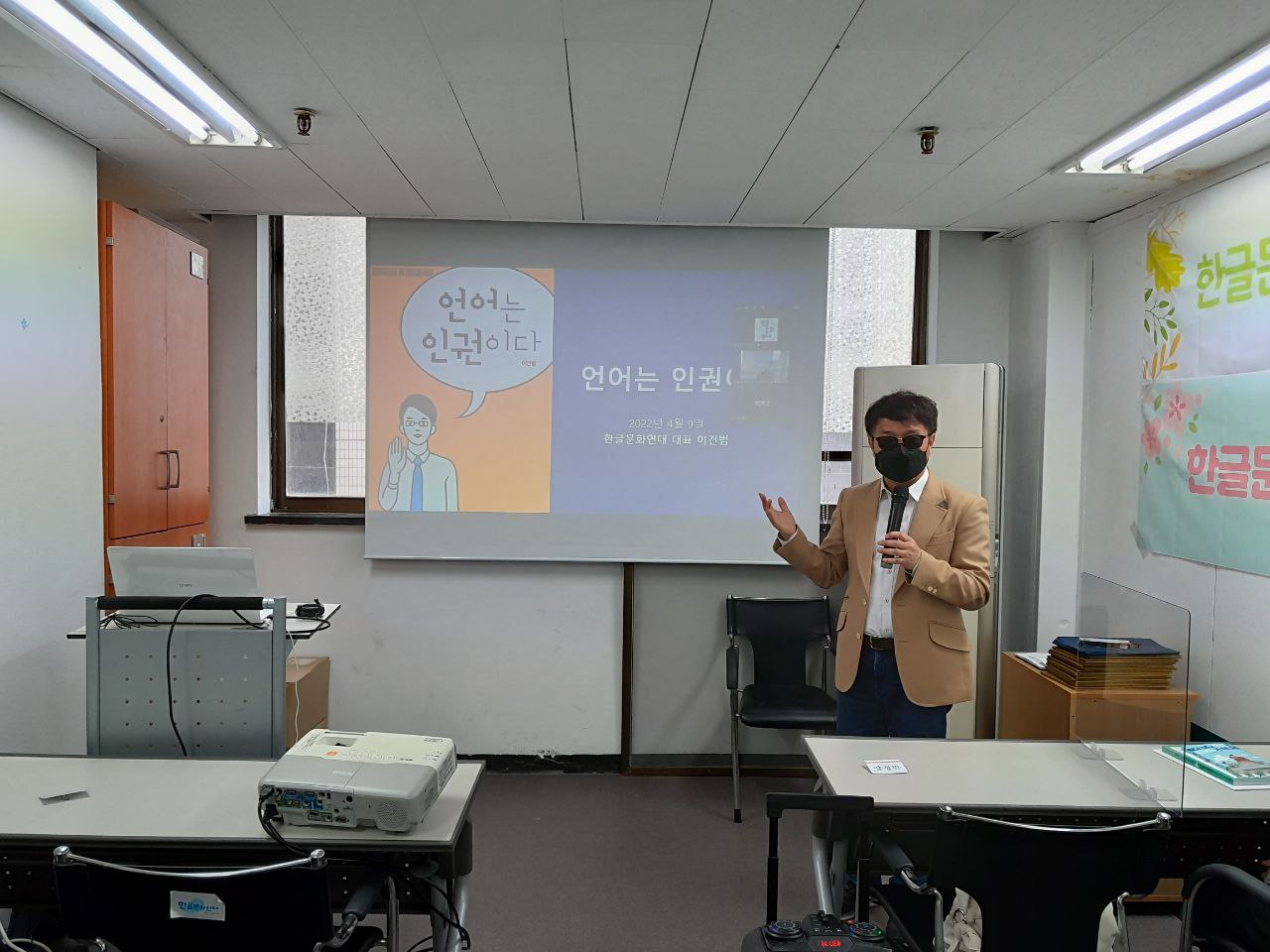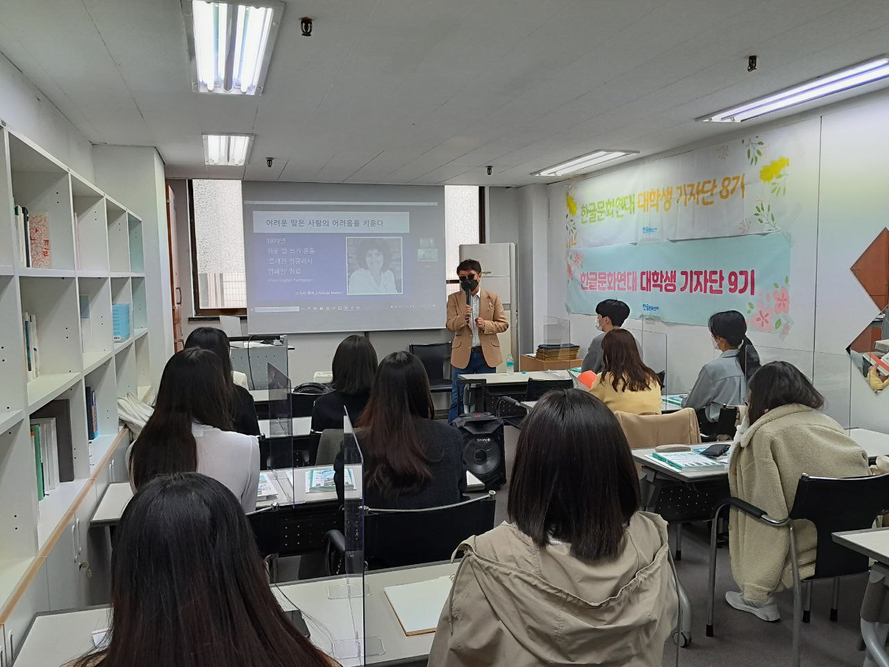 먼저 한글문화연대와 기자단을 소개하는 시간을 가졌습니다. 소개를 맡으신 김명진 부대표님은 크게 '한글 운동의 역사'와 '기사를 작성할 때 주의할 점' 두 가지 주제로 기자단과 소통하였으며, '젊은 대학생들이 한글문화연대의 새 희망이 되어주었으면 한다'고 당부하였습니다.