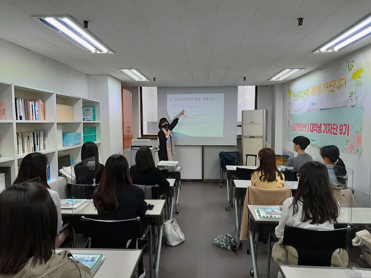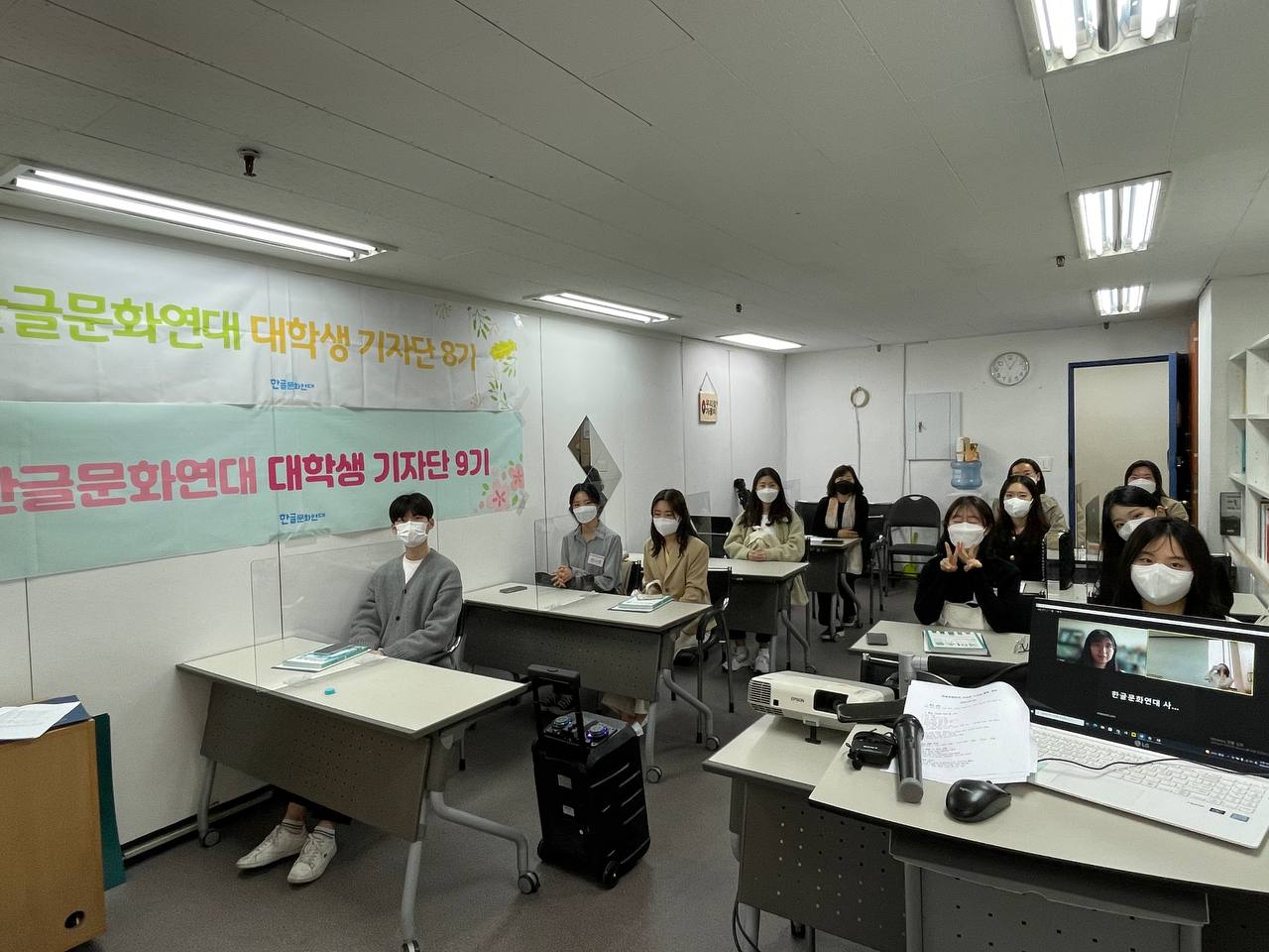 2022년 4월 9일 토요일 오전 9시 30분, 활짝에서 한글문화연대 대학생 기자단 8기 마침 마당과 9기 오름 마당을 열었습니다. 행사에 8기 기자단 7명, 9기 기자단 11명이 현장 참석하였고, 9기 기자단 1명이 비대면(온라인)으로 참석하였습니다.