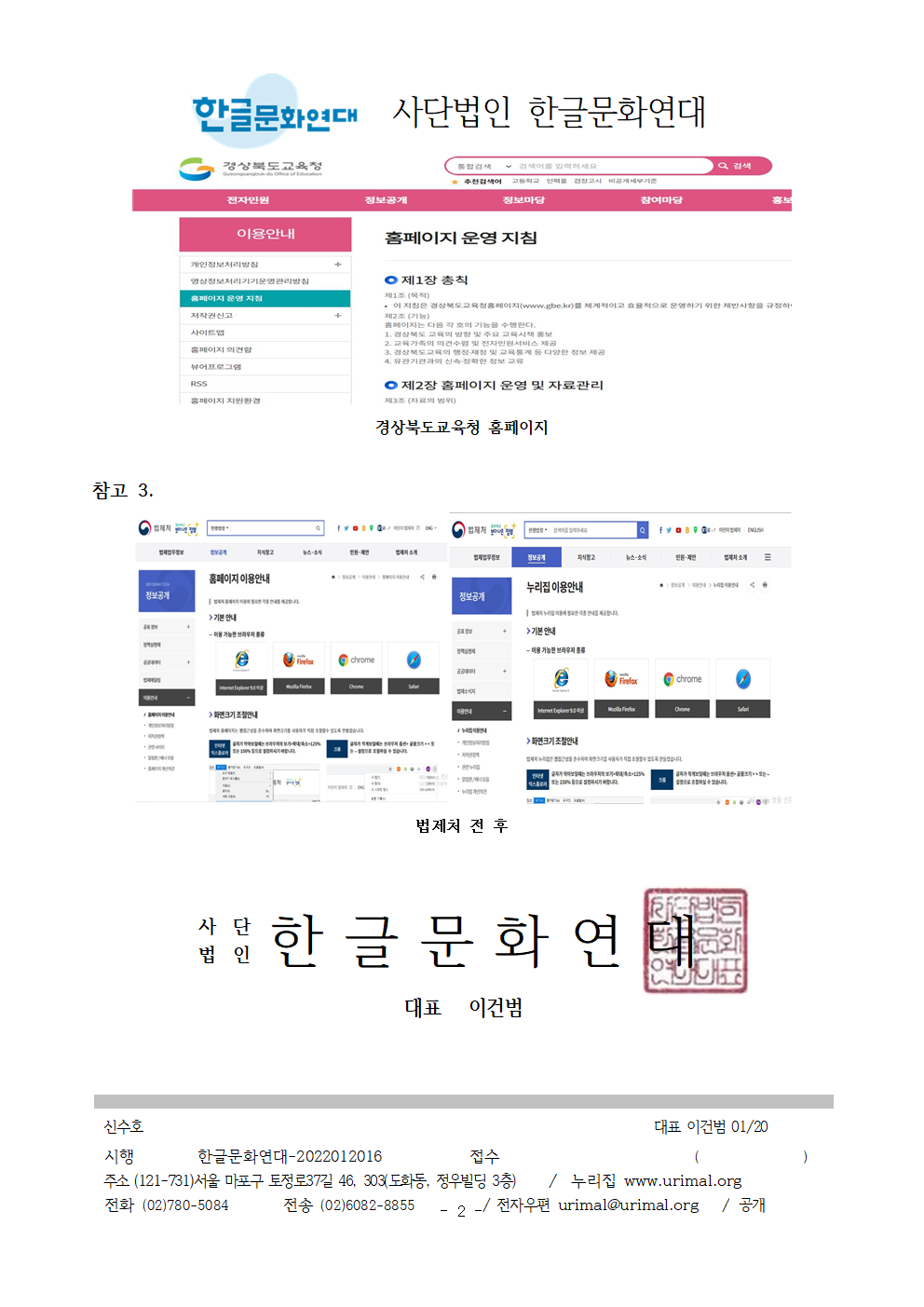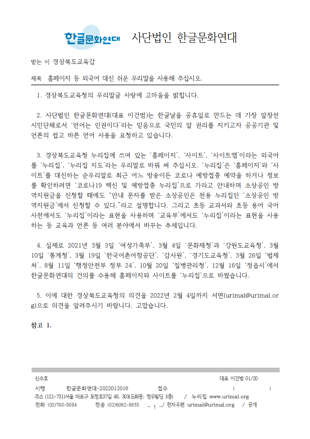 5. 이에 대한 경상북도교육청의 의견을 2022년 2월 4일까지 서면(urimal@urimal.org)으로 의견을 알려주시기 바랍니다. 고맙습니다.