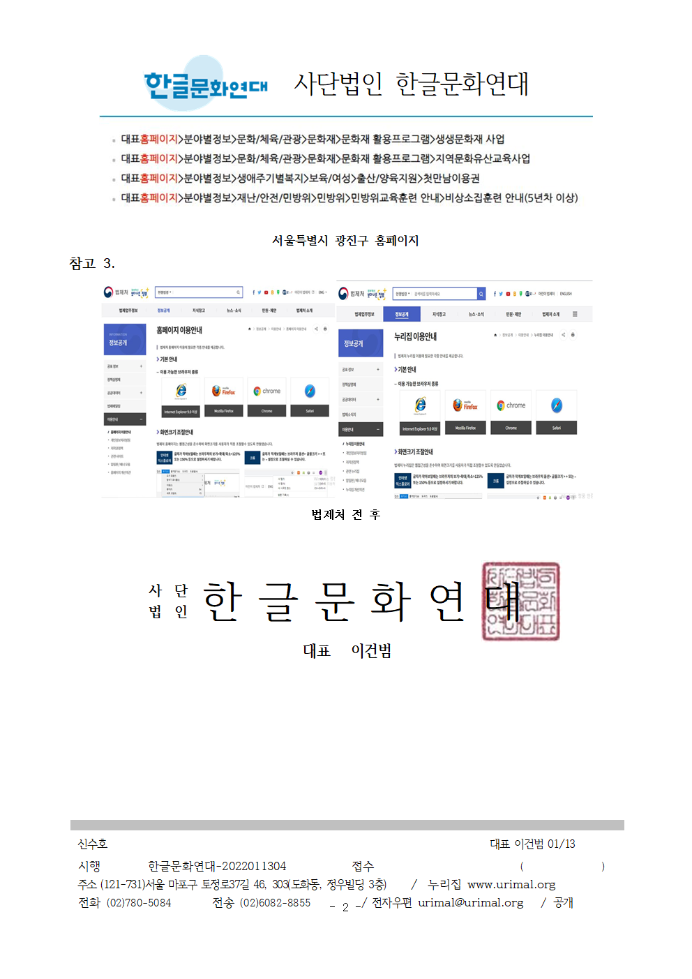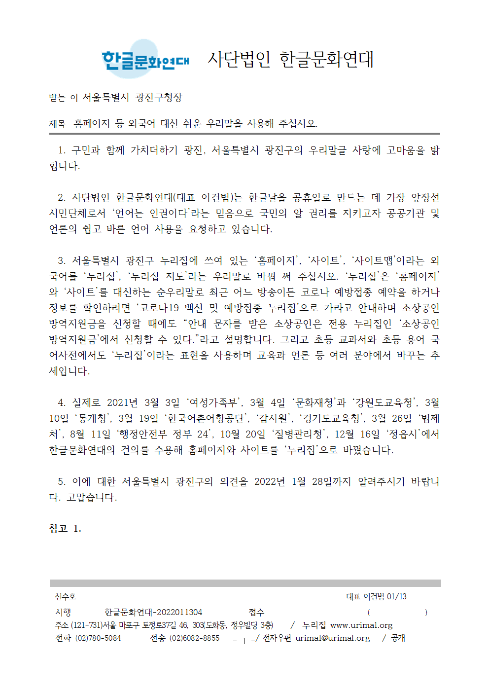| [공문/답변] 홈페이지 등 외국어 대신 쉬운 우리말을 사용해 주십시오. 서울특별시 광진구 2022.02.09 (0) | 2022.04.27 |