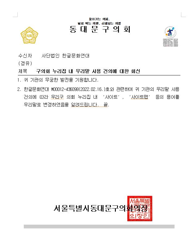 | [공문/답변] 사이트 등 외국어 대신 쉬운 우리말을 사용해 주십시오. 서울특별시 광진구의회 2022.02.21 (0) | 2022.04.27 |