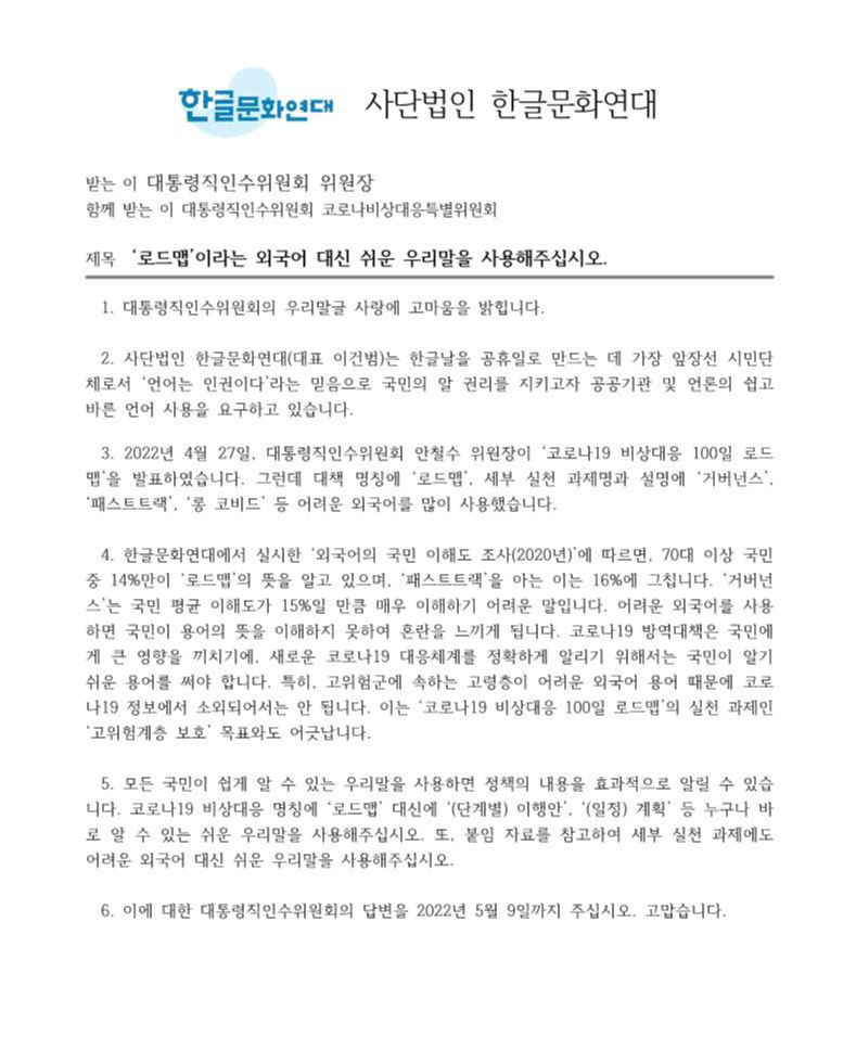[공문] '로드맵'이라는 외국어 대신 쉬운 우리말을 사용해주십시오. 대통령직인수위원회 2022. 04. 28.