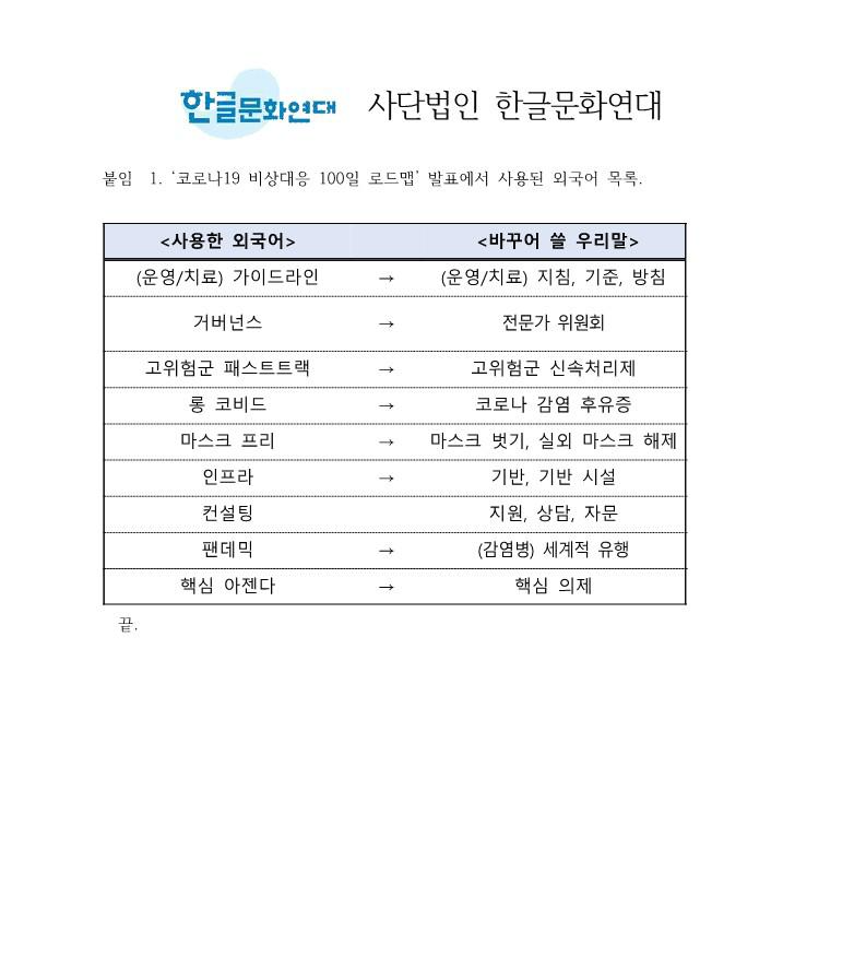붙임 1. ‘코로나19 비상대응 100일 로드맵발표에서 사용된 외국어 목록.