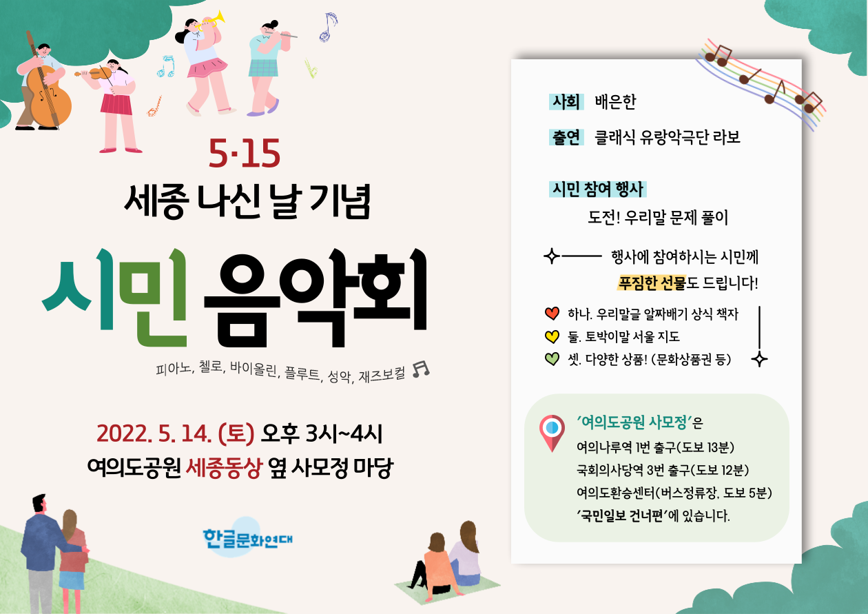 2022년 5월 14일 토요일, 일상 회복 시기를 맞아 625돌 세종 나신 날 기념 시민 음악회를 엽니다.