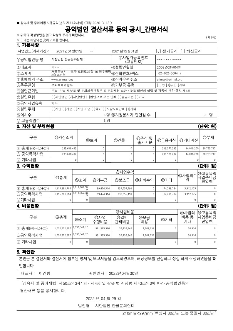 한글문화연대의 2021년 공익법인 결산서류 등의 공시 및 기부금 활용실적 명세서를 '아래'와 같이 공유합니다. 국세청 홈택스(www.hometax.go.kr/)에서도 확인하실 수 있습니다. (국세청 홈택스 – 공익법인 결산서류 공시 – 공시/공개 열람하기 – 공익법인 결산서류 등 공시 – [한글문화연대]로 조회)