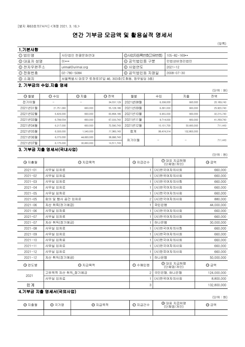 한글문화연대의 2021년 공익법인 결산서류 등의 공시 및 기부금 활용실적 명세서를 '아래'와 같이 공유합니다. 국세청 홈택스(www.hometax.go.kr/)에서도 확인하실 수 있습니다. (국세청 홈택스 – 공익법인 결산서류 공시 – 공시/공개 열람하기 – 공익법인 결산서류 등 공시 – [한글문화연대]로 조회)