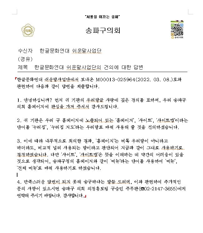 1. 안녕하십니까? 먼저 귀 기관의 우리말글 사랑에 깊은 경의를 표하며, 우리 송파구의회 홈페이지에 관심을 가져 주셔서 감사드립니다.