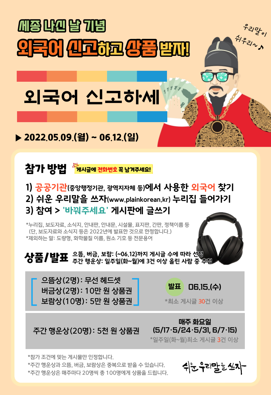 *주간 행운상은 쉬운 우리말을 쓰자 누리집 '공지' 게시판에, 최종 수상자는 '공지' 게시판과 한글문화연대 누리집에 공지합니다.