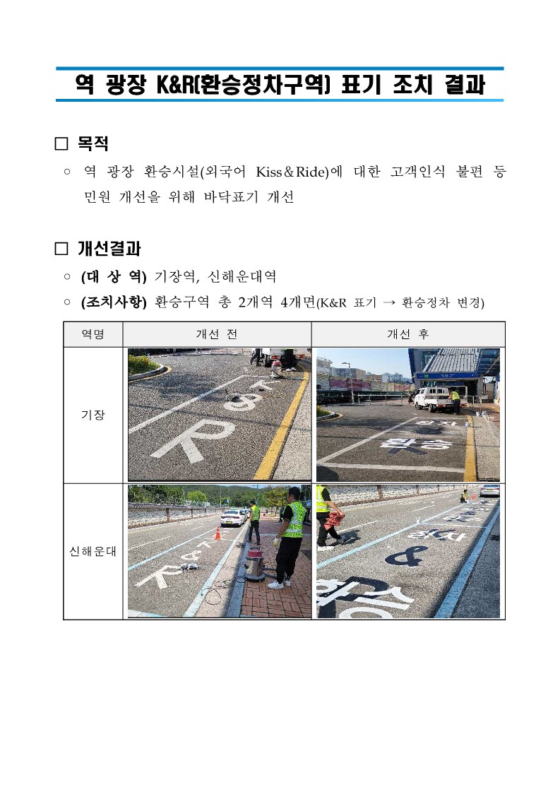 동해선 기장역과 신해운대역 광장에 K&R표기 개선 조치결과를 붙임과 같이 알려드리니 업무에 참고하시기 바랍니다.