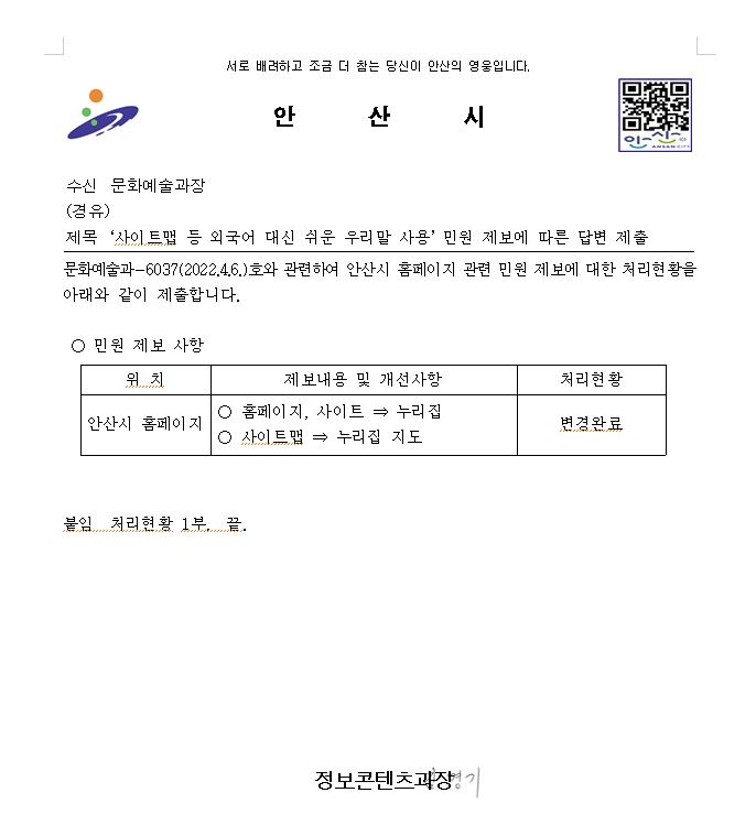 [공문/답변] 사이트맵 등 외국어 대신 쉬운 우리말을 사용해 주십시오. 안산시 2022.04.11