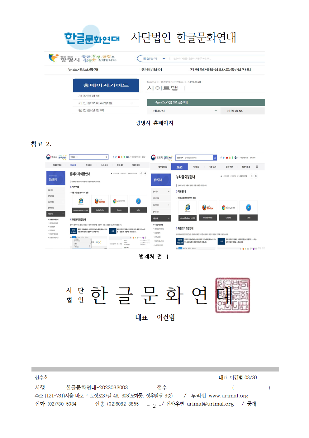 5. 이에 대한 광명시의 의견을 2022년 4월 15일까지 서면(urimal@urimal.org)으로 의견을 알려주시기 바랍니다. 고맙습니다.