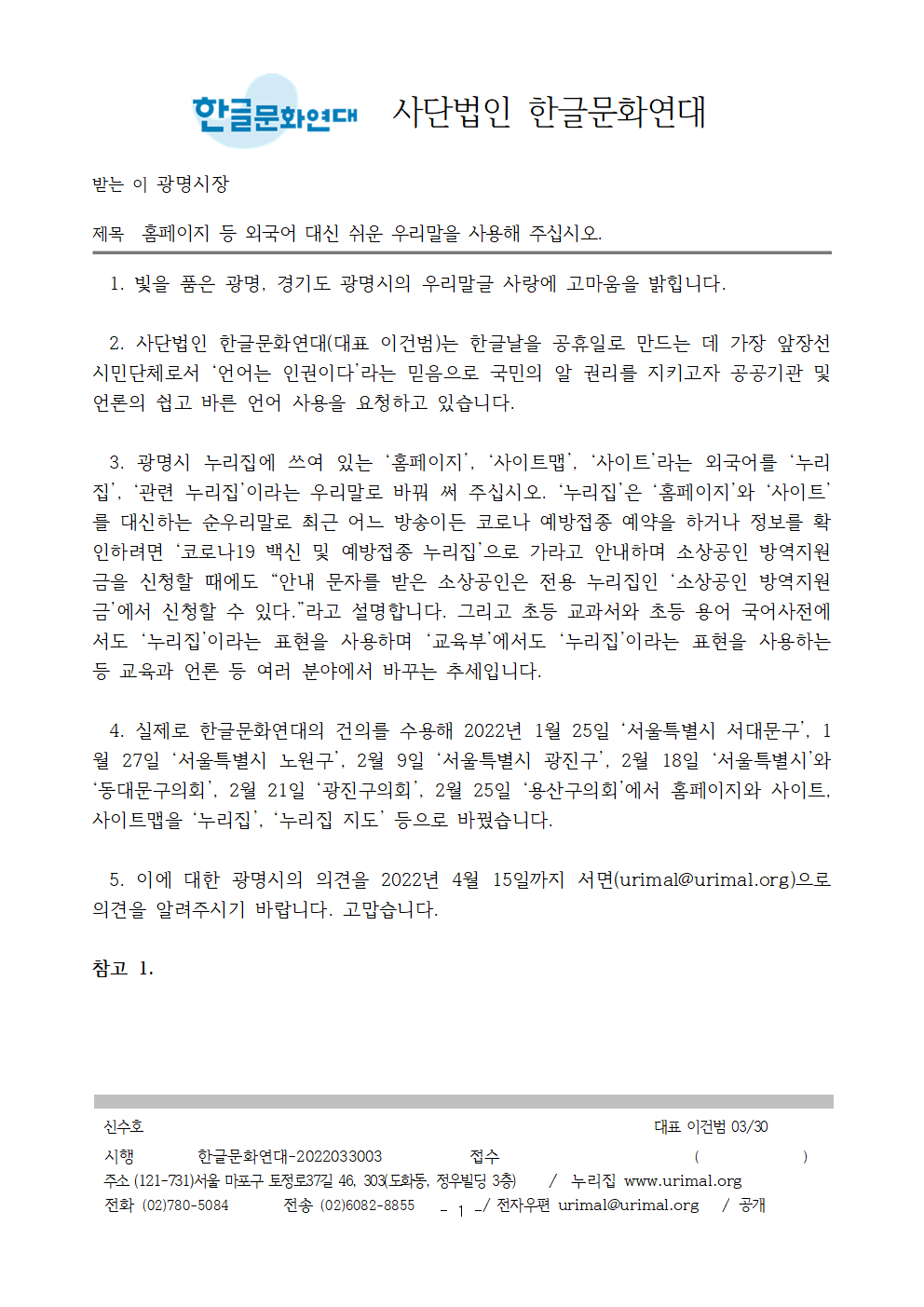 | [공문/답변] 홈페이지 등 외국어 대신 쉬운 우리말을 사용해 주십시오. 광명시 2022.04.14 (0) | 2022.06.27 |