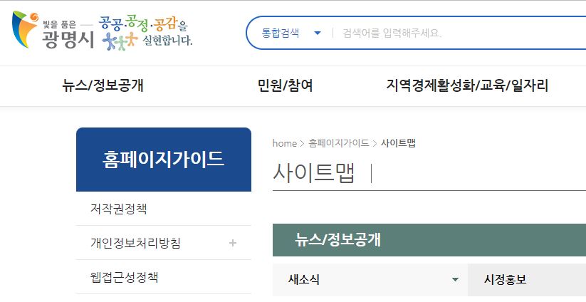3. 광명시 누리집에 쓰여 있는 ‘홈페이지’, ‘사이트맵’, ‘사이트’라는 외국어를 ‘누리집’, ‘관련 누리집’이라는 우리말로 바꿔 써 주십시오. ‘누리집’은 ‘홈페이지’와 ‘사이트’를 대신하는 순우리말로 최근 어느 방송이든 코로나 예방접종 예약을 하거나 정보를 확인하려면 ‘코로나19 백신 및 예방접종 누리집’으로 가라고 안내하며 소상공인 방역지원금을 신청할 때에도 “안내 문자를 받은 소상공인은 전용 누리집인 ‘소상공인 방역지원금’에서 신청할 수 있다.”라고 설명합니다. 그리고 초등 교과서와 초등 용어 국어사전에서도 ‘누리집’이라는 표현을 사용하며 ‘교육부’에서도 ‘누리집’이라는 표현을 사용하는 등 교육과 언론 등 여러 분야에서 바꾸는 추세입니다.