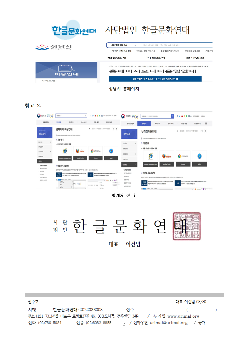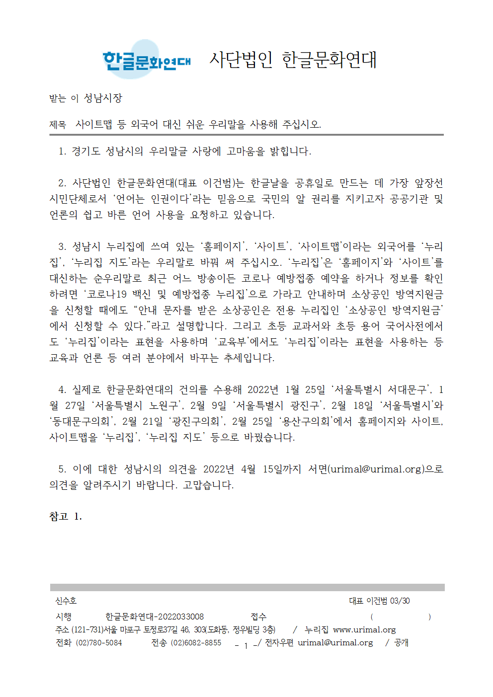 5. 이에 대한 성남시의 의견을 2022년 4월 15일까지 서면(urimal@urimal.org)으로 의견을 알려주시기 바랍니다. 고맙습니다.