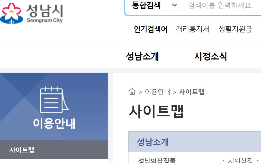 3. 성남시 누리집에 쓰여 있는 ‘홈페이지’, ‘사이트’, ‘사이트맵’이라는 외국어를 ‘누리집’, ‘누리집 지도’라는 우리말로 바꿔 써 주십시오. ‘누리집’은 ‘홈페이지’와 ‘사이트’를 대신하는 순우리말로 최근 어느 방송이든 코로나 예방접종 예약을 하거나 정보를 확인하려면 ‘코로나19 백신 및 예방접종 누리집’으로 가라고 안내하며 소상공인 방역지원금을 신청할 때에도 “안내 문자를 받은 소상공인은 전용 누리집인 ‘소상공인 방역지원금’에서 신청할 수 있다.”라고 설명합니다. 그리고 초등 교과서와 초등 용어 국어사전에서도 ‘누리집’이라는 표현을 사용하며 ‘교육부’에서도 ‘누리집’이라는 표현을 사용하는 등 교육과 언론 등 여러 분야에서 바꾸는 추세입니다.