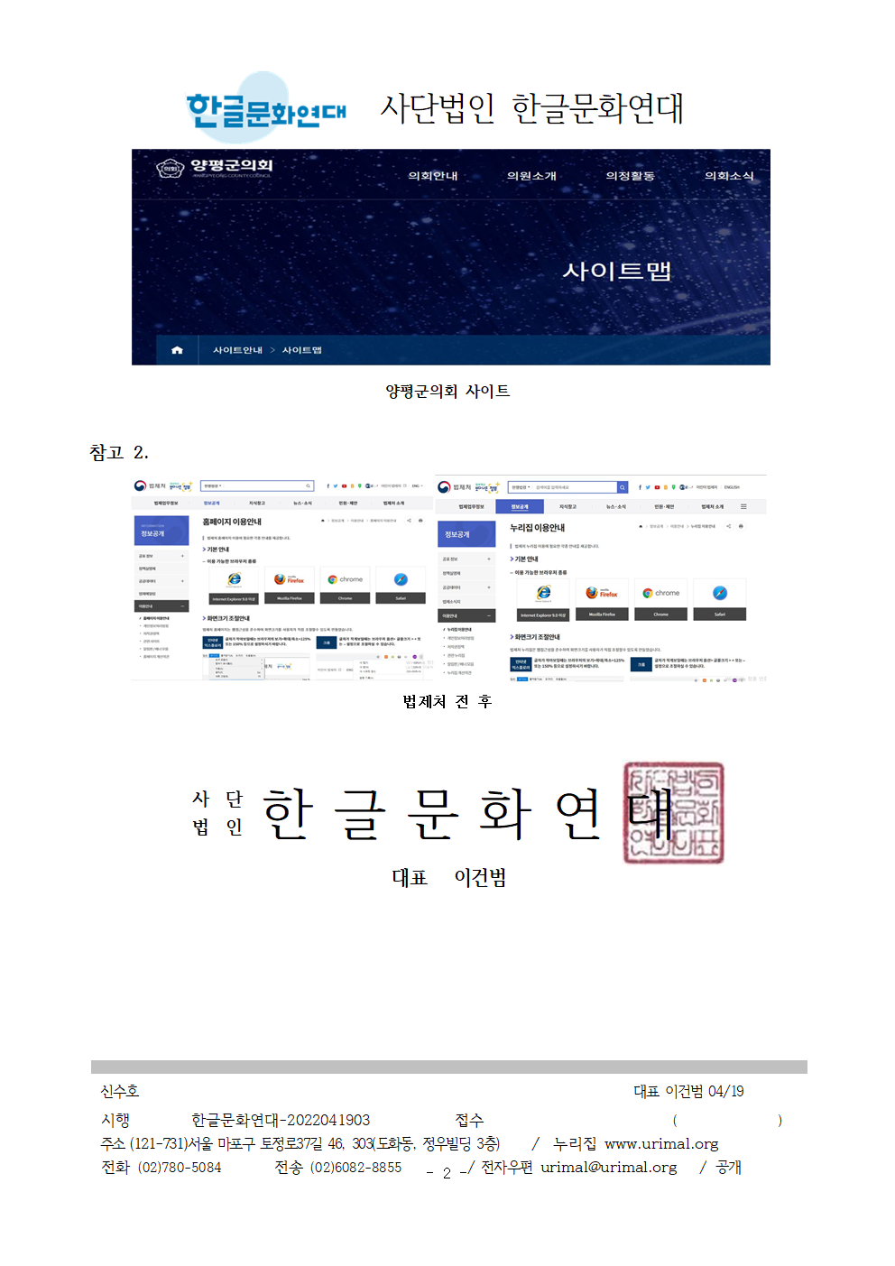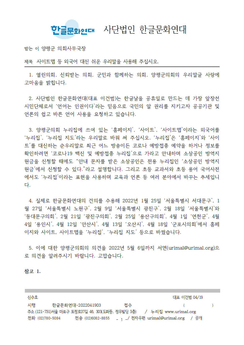 5. 이에 대한 양평군의회의 의견을 2022년 5월 6일까지 서면(urimal@urimal.org)으로 의견을 알려주시기 바랍니다. 고맙습니다.