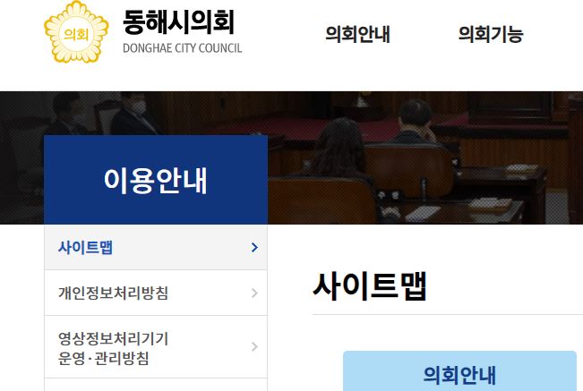 3. 동해시의회 누리집에 쓰여 있는 ‘홈페이지’, ‘사이트’, ‘사이트맵’이라는 외국어를 ‘누리집’, ‘누리집 지도’라는 우리말로 바꿔 써 주십시오. ‘누리집’은 ‘홈페이지’와 ‘사이트’를 대신하는 순우리말로 최근 어느 방송이든 코로나 예방접종 예약을 하거나 정보를 확인하려면 ‘코로나19 백신 및 예방접종 누리집’으로 가라고 안내하며 소상공인 방역지원금을 신청할 때에도 “안내 문자를 받은 소상공인은 전용 누리집인 ‘소상공인 방역지원금’에서 신청할 수 있다.”라고 설명합니다. 그리고 초등 교과서와 초등 용어 국어사전에서도 ‘누리집’이라는 표현을 사용하며 교육과 언론 등 여러 분야에서 바꾸는 추세입니다.